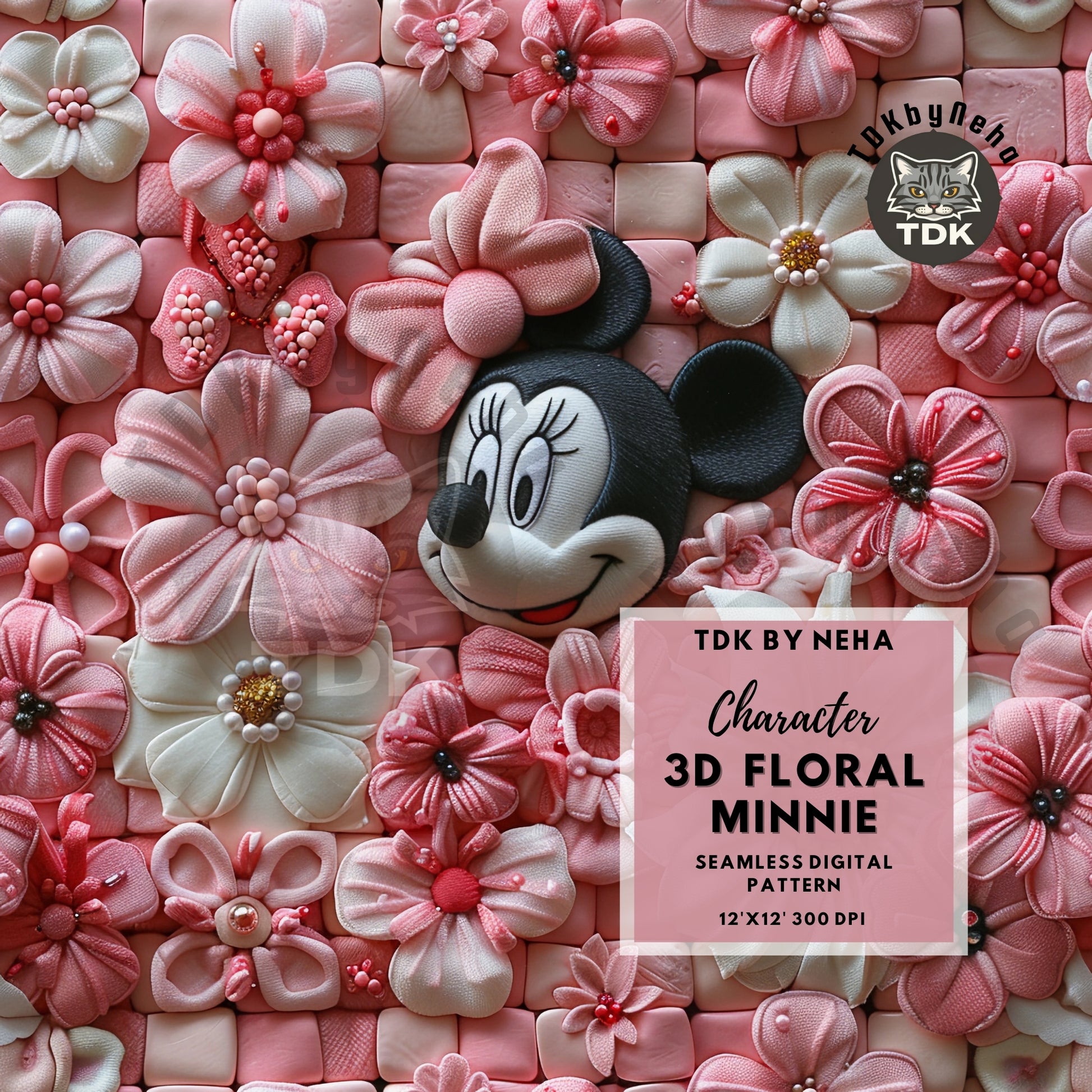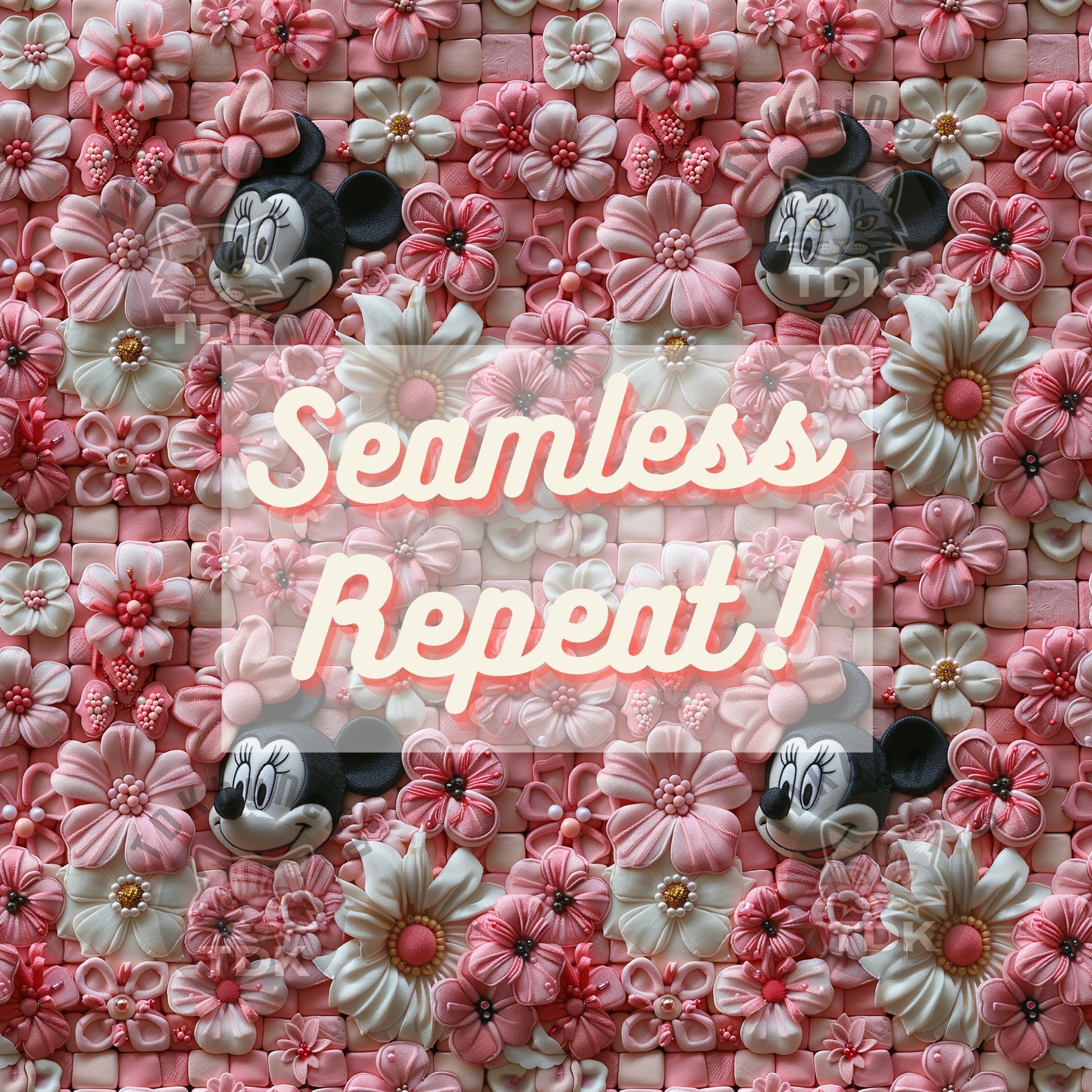 Instant Download 3D Girl Mouse Pink Floral Seamless Digital Paper for Fabric Printing, Cute Magical Kingdom Character Seamless Repeat Sublimation Design